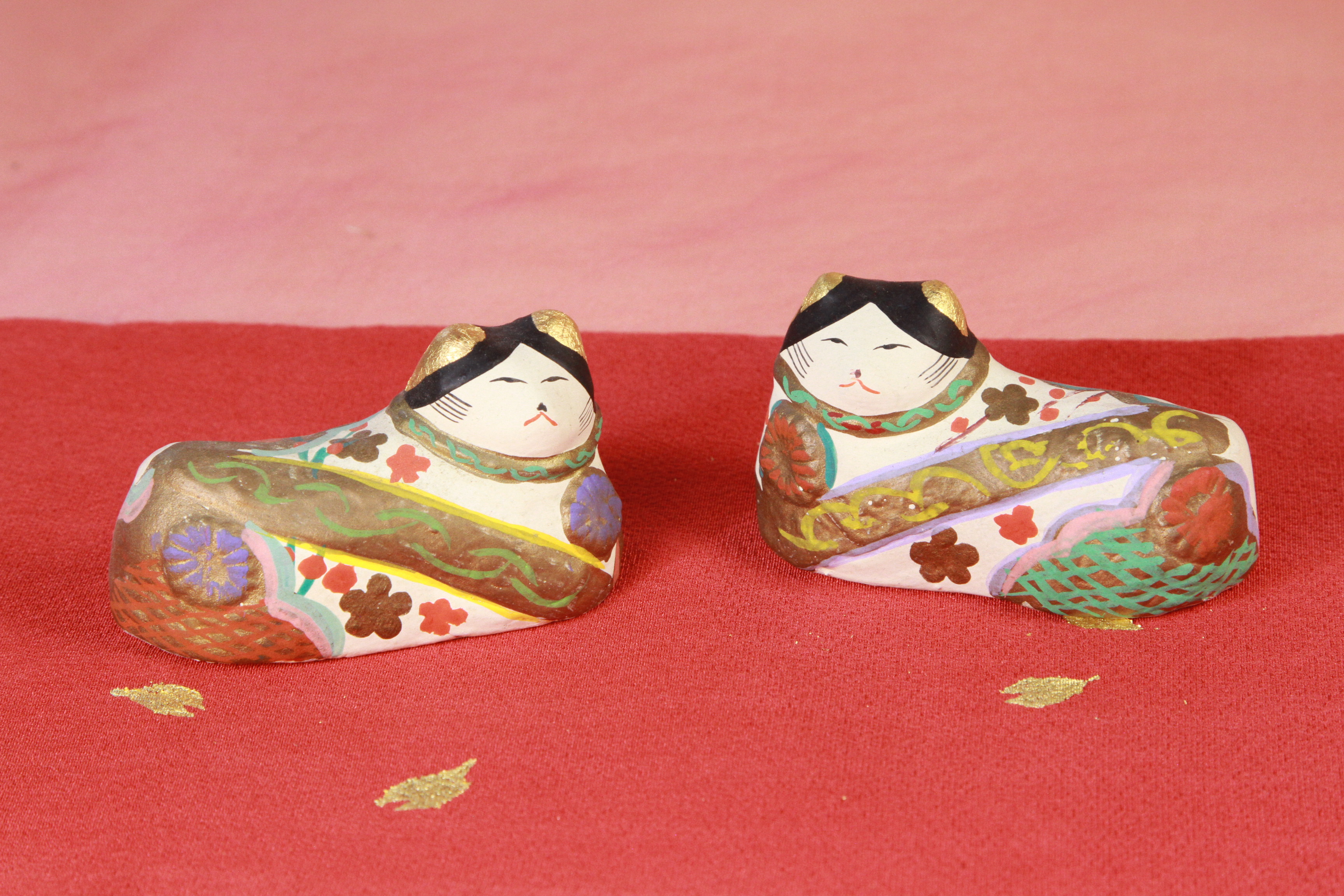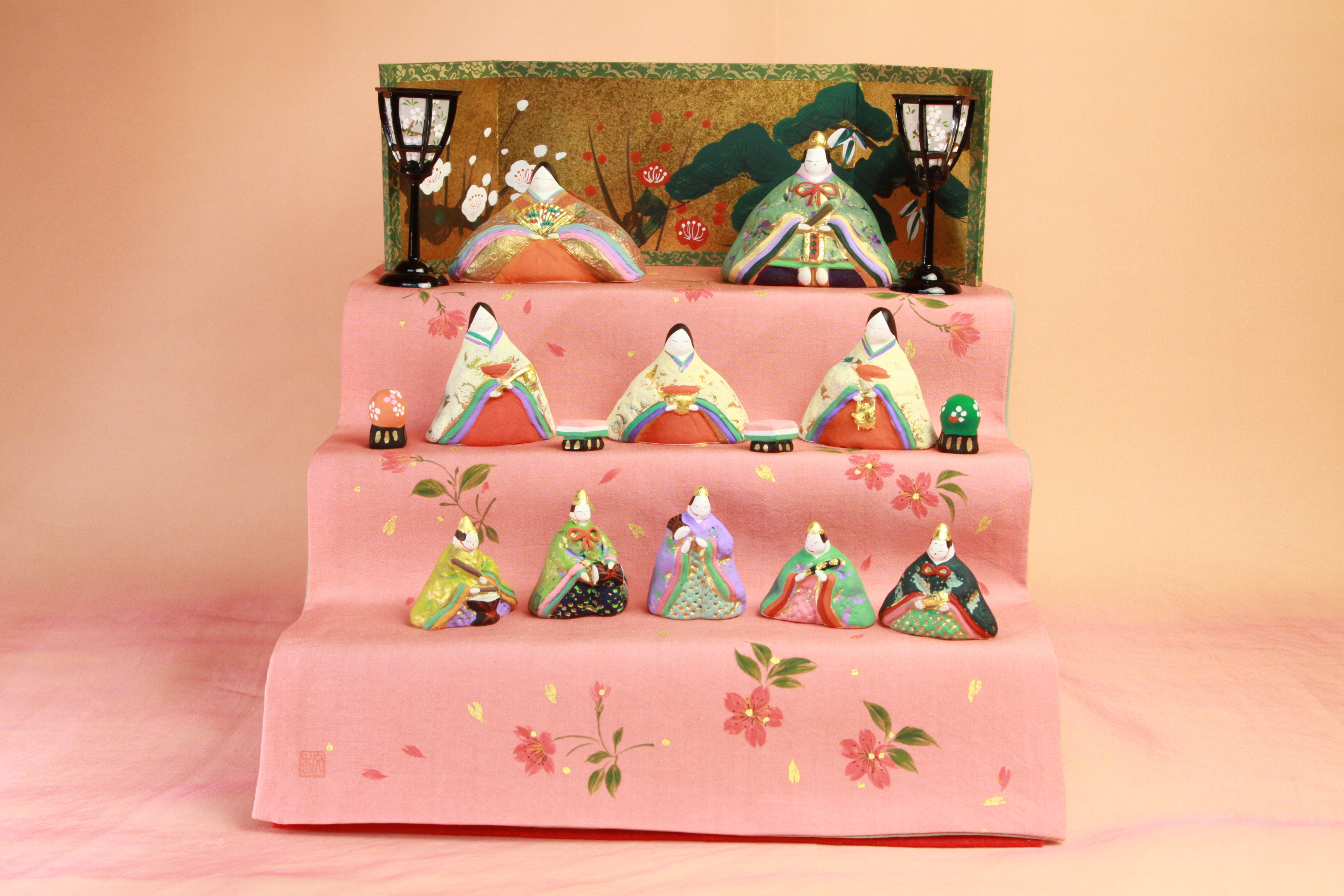 小さき物の世界14番の詳細 在庫あり 明治の小箱と、ピンクの花びらを散りばめた手描き彩色の三段飾り(桐箱入り) マンション住まいの方が、いかに限られたスペースでも日本古来の伝統に則ってひな祭りが出来るかを考えた雛人形セットです。幅80cm×奥行き40cm×高さ30cm 雛壇全体をやや斜めから撮影した写真です。雛壇全体の奥行きが20cmですから、マンションやアパートの本棚にもすっぽりと収まります。使用している布は、染色の清家文香さんが丹後ちりめんを赤とピンクに染めています。 内裏雛の拡大写真です。高さが7〜8cm余りで、背後の屏風から左右の油灯に至るまで、このお雛様に合わせて手作りした物です。高さ7〜8cm 三人官女の拡大写真です。大きさは6cm余りで、持っている道具類は全て金箔仕上げにしています。6〜7cm 五人囃子の拡大写真です。囃子は向かって右から歌い手、笛、小鼓、大鼓、太鼓と、左に行くほど大きい音になっています。高さ5〜7cm 三段飾りを正面から撮影した所です。幅が30cm奥行きが40cm×高さが30cmです。 雛壇全体をやや斜めから撮影した写真です。三段飾りのキットは組み立て式になっています。 明治の蒔絵たんすで大きさが横20cm×奥行き8cm×高さ21cmになり、完品です。 引き出しを開けてみると、中は京唐紙が張られています。 同じく明治の長持ちです。しっかりとした作りで雛道具を入れることが出来ます。大きさは横25cm×奥行き13cm×高さ13cm 同じく中は、京唐紙が貼ってあります。 屏風も1つ1つが手作りで手描きのもので、ヘリは京都の緞子専門店にて特注した物を使っております。大きさは10cm×35cmです みかわ工房で制作したミニサイズの貝合わせです。白地と金地の2種類があり、季節の花を手描き彩色しています。貝合わせの大きさは4〜5cmです。布の大きさは15cm×20cmです。 ミニュチュアサイズの古い腕を付けてみました。大きさは7cm×高さ5cmです。 こま犬の大きさは7cm×4cmです。 前のページ へ 次のページへ