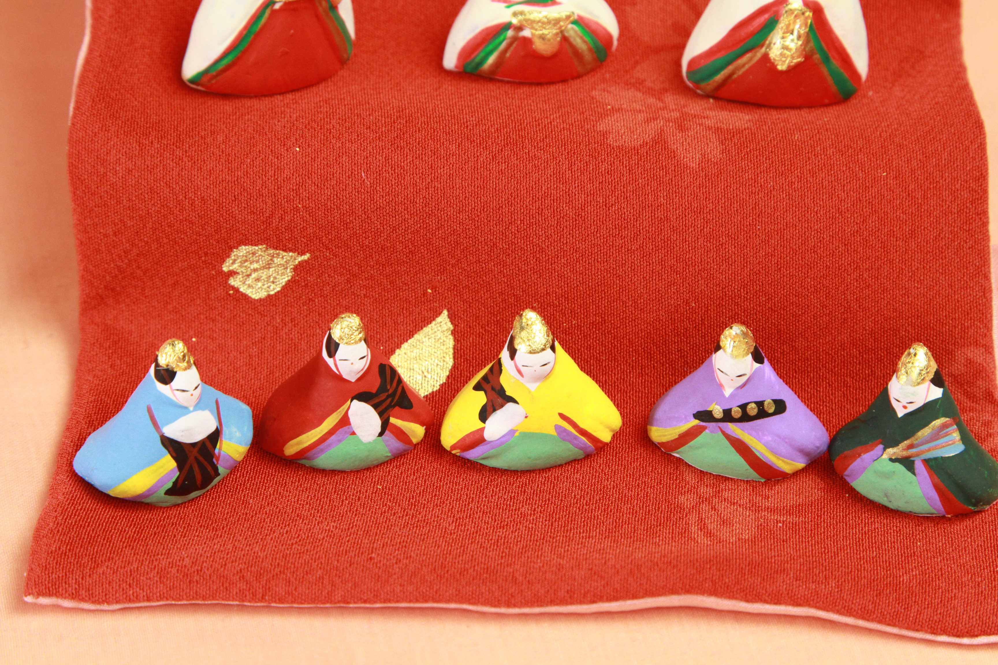 小さき物の世界24番の詳細 木工家に依頼して金蒔絵した貝桶に、ミニサイズの三段飾りや貝合わせ、こま犬を組み合わせてみました。 桧の貝桶と三段飾りのお雛様です 横幅13cm、高さが15cm余りの貝桶(桧材)に四季の花の蒔絵を施し、その箱からお雛様を1つ1つ出して三段飾りを作り上げる楽しさを演出してみました。 三段飾りの大きさです。幅が11cmで、奥行きが20cm足らずのミニサイズです。 内裏雛の拡大写真です。高さが3cm余りで、背後の屏風から左右の油灯に至るまで、このお雛様に合わせて手作りした物です。 三人官女の拡大写真です。大きさは3cm余りで、持っている道具類は全て金箔仕上げにしています 五人囃子の拡大写真です。囃子は向かって右から歌い手、笛、小鼓、大鼓、太鼓と、左に行くほど大きい音になっています。 雛祭りの雛道具で、桃に橘1,5cm、菱餅2cm、こま犬2,5cm、貝合わせ2cm、お椀3×3cmなどを並べています。 屏風も1つ1つが手作りで手描きのもので、ヘリは京都の緞子専門店にて特注した物を使っております。大きさは11×5cmです。 貝桶です。大きさは横13cm、高さが15cm余りで、桧の組木で四季の花を手描き彩色しています。画面は菖蒲 裏面は、白アヤメと秋の紅葉です 前のページ へ 次のページへ
